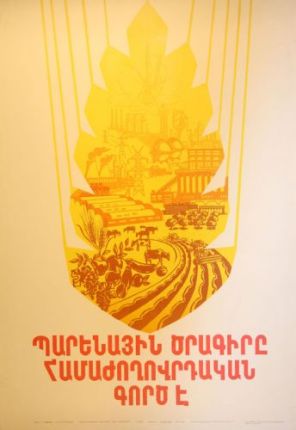 An idealized Armenian kolkhoznitsa (колхозница) in a poster that reads Wide Way for Workers’ Brigade (Լայն ճանապարհ բրիգադային կապալին).