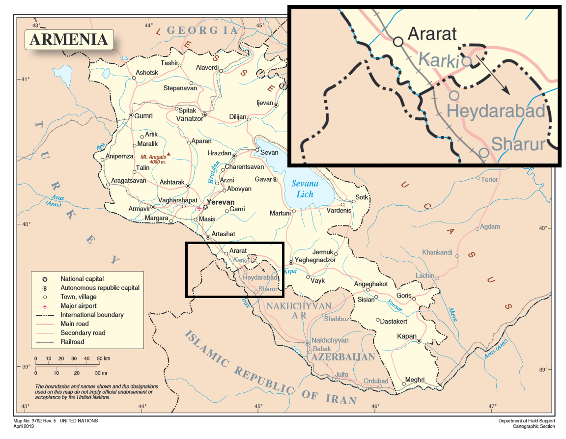 UN Map of Armenia with the Araks corridor highlighted. Published February 23, 2015 at 1152 × 894 in Debunking a Caucasian Myth ← Previous Next → UN Map of Armenia with the Araks corridor highlighted.
